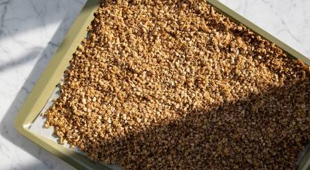 - La jumătate din timpul de coacere, întoarceți granola, folosind o spatulă de lemn, și uniformizați-o din nou.